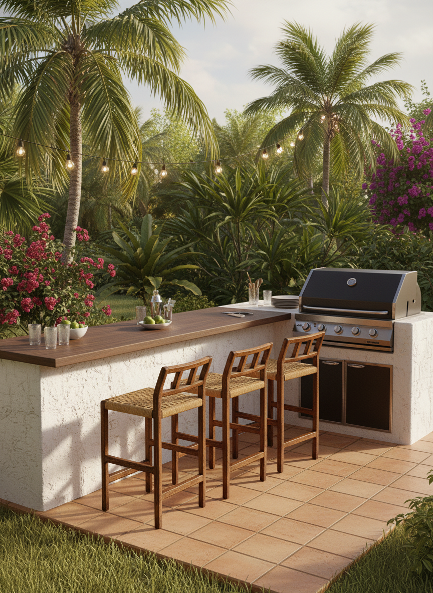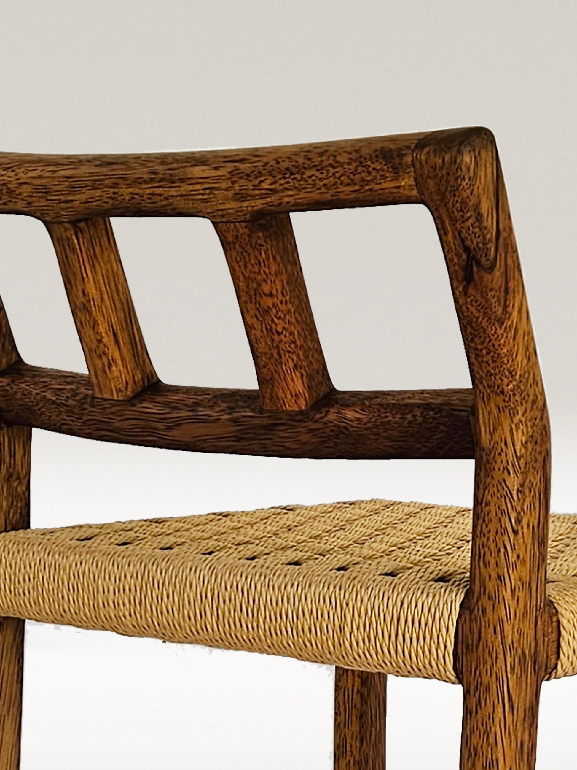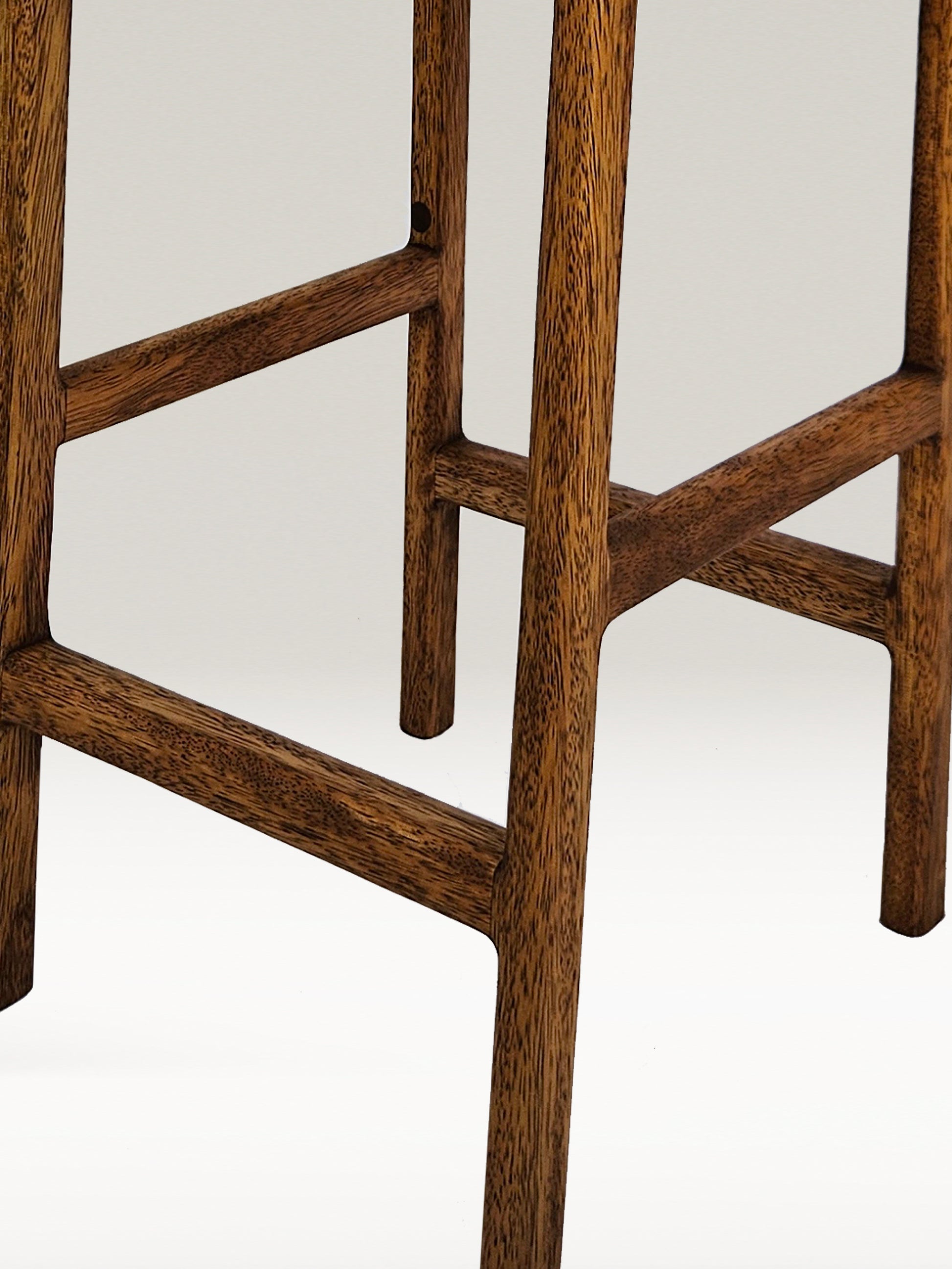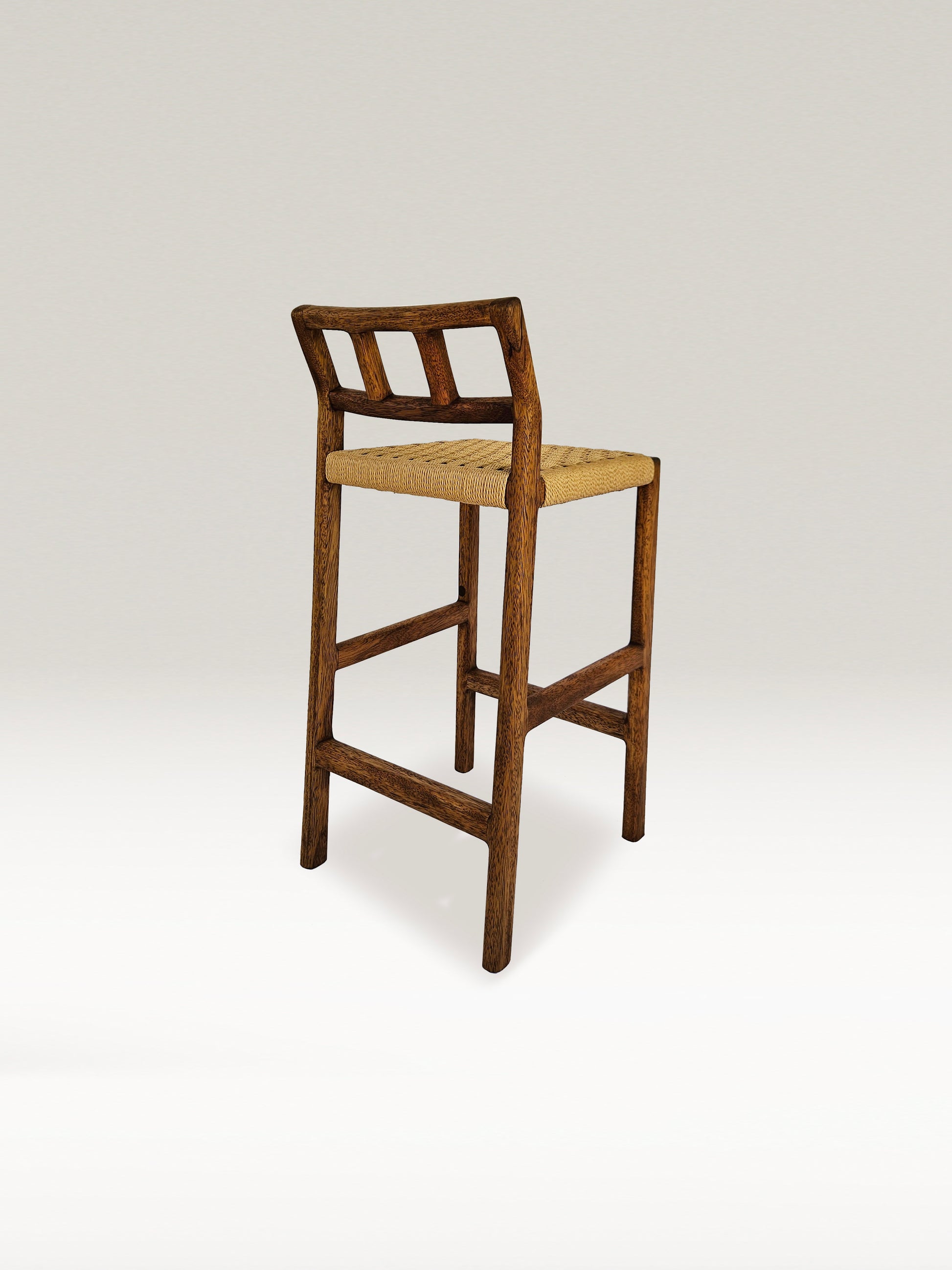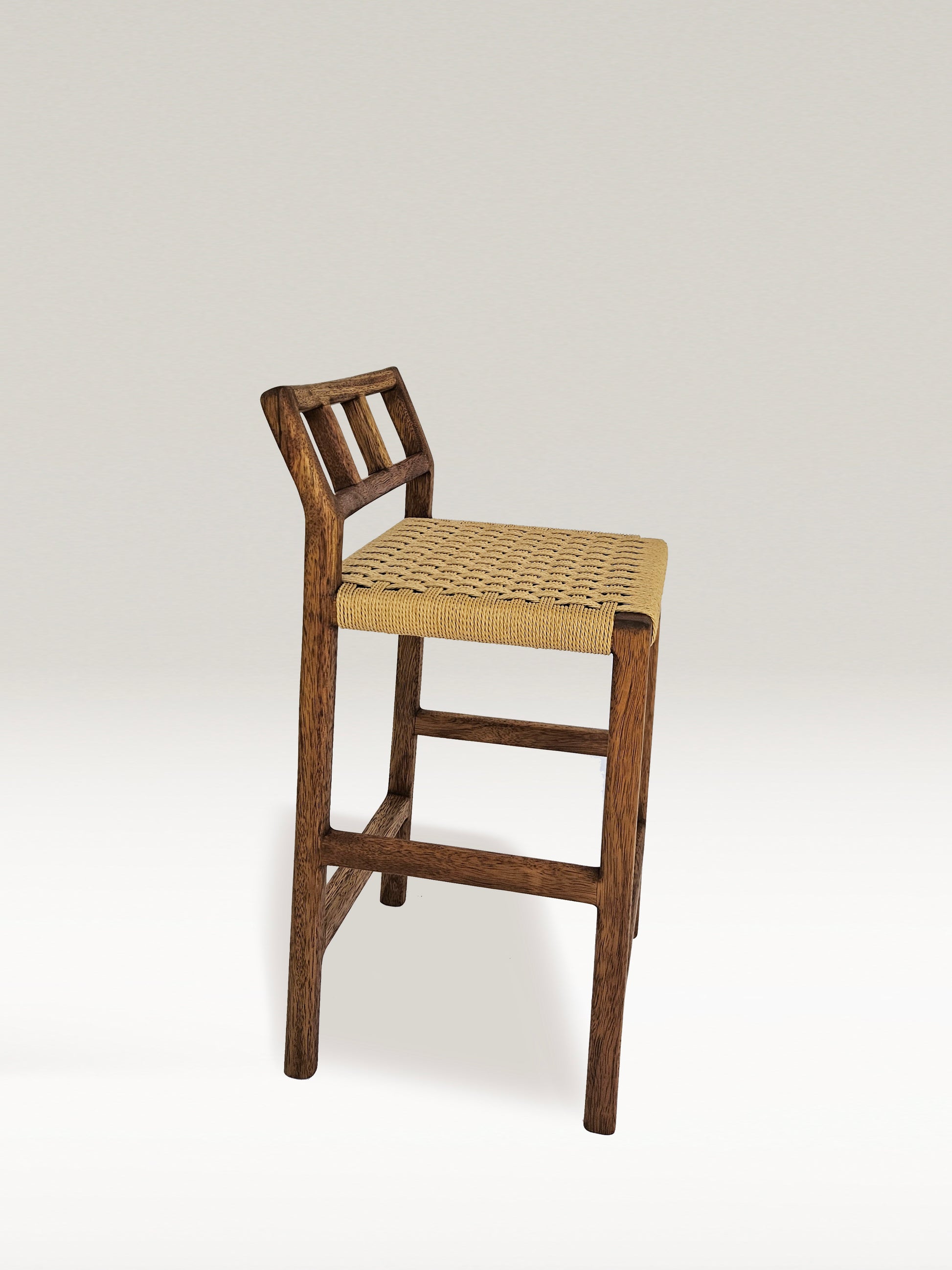 El banco para barra de la línea Formentor, esta elaborado en madera Tornillo o Rosa Morada. Esta tejido a mano en cordón danés para interior o cuerda sintética verde olivo para exterior.