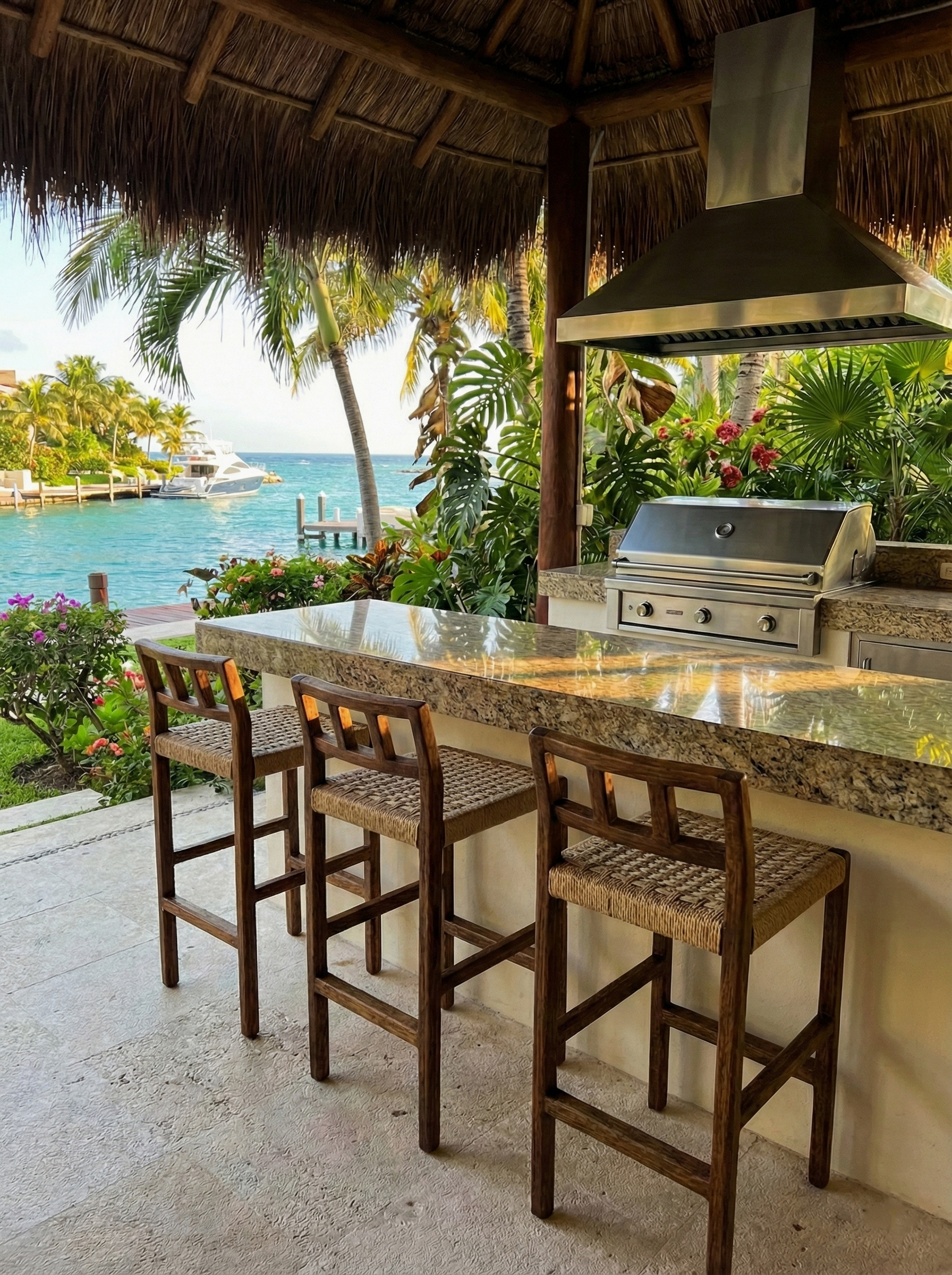 El banco para barra de la línea Formentor, esta elaborado en madera Tornillo o Rosa Morada. Esta tejido a mano en cordón danés para interior o cuerda sintética beige para exterior.