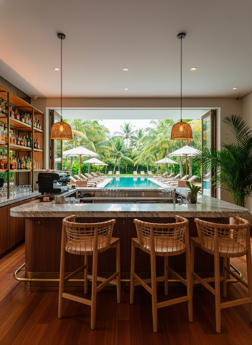 El Banco para Barra Holbox, esta elaborado en madera Rosa Morada o Tornillo y cuenta con un tejido de cordón danés para interior.