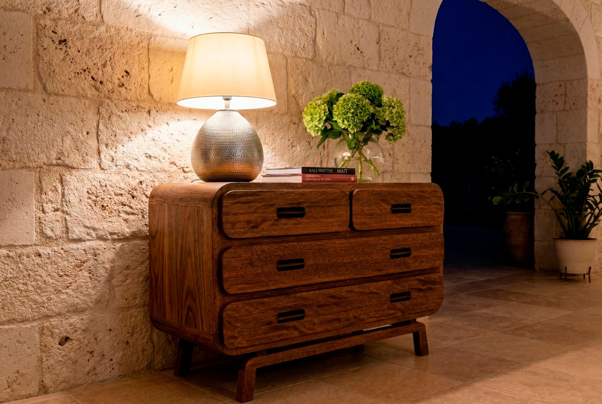 La Comoda Formentor esta elaborada en madera Tornillo, que por su atractiva veta, hace que sea un mueble muy confortable y agradable a la vista.