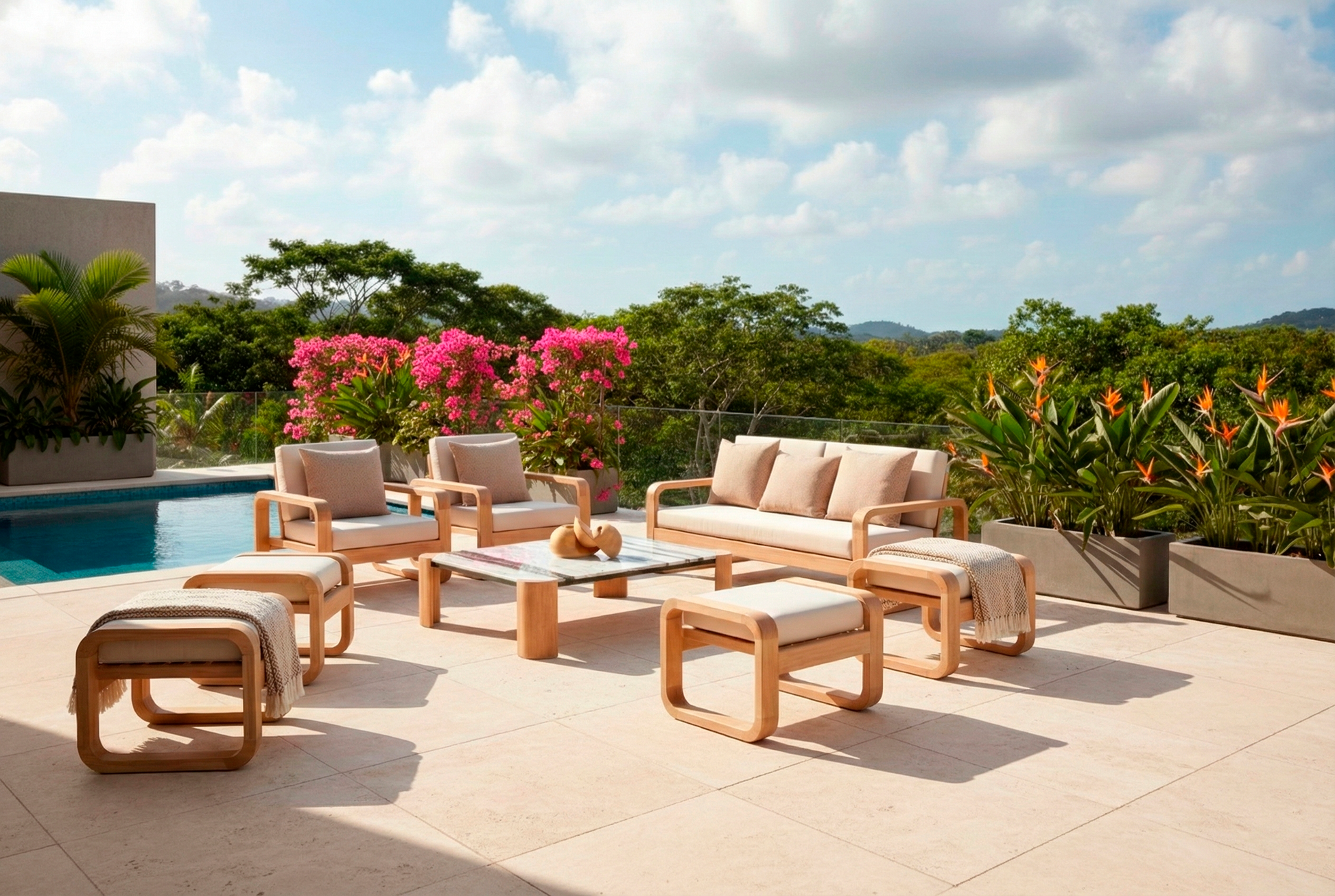 La Sala Formentor está elaborada en madera Rosa Morada, en acabado natural, con cojines elaborados con tela de marca Sunbrella. Esta conformado por un sofá triple, dos sillones individuales y dos bancos. La mesa de centro se vende por separado.