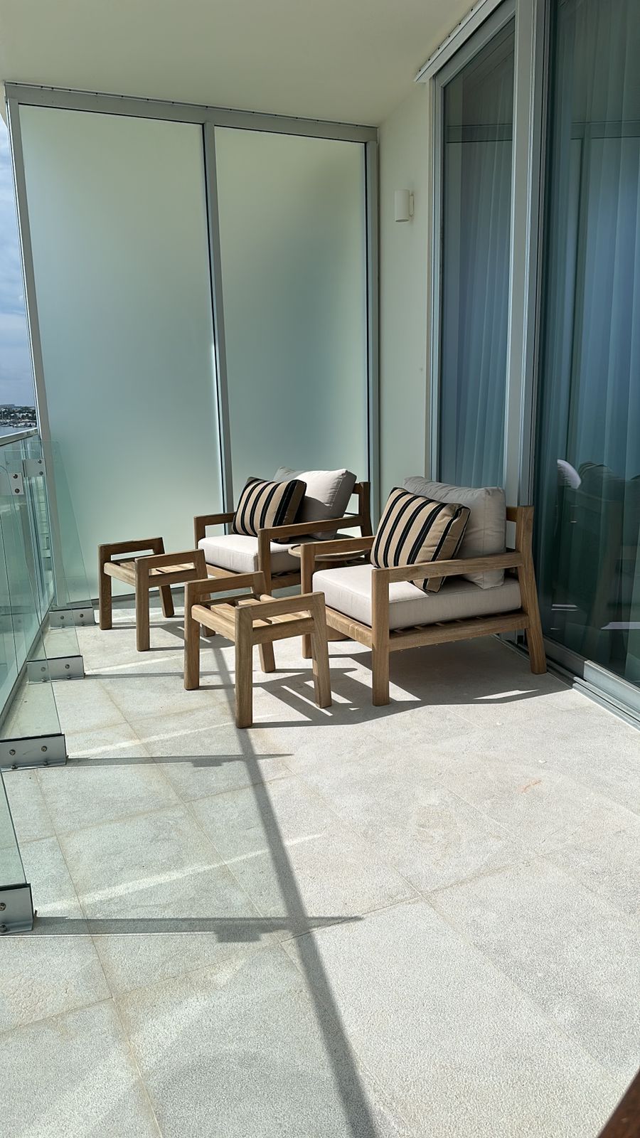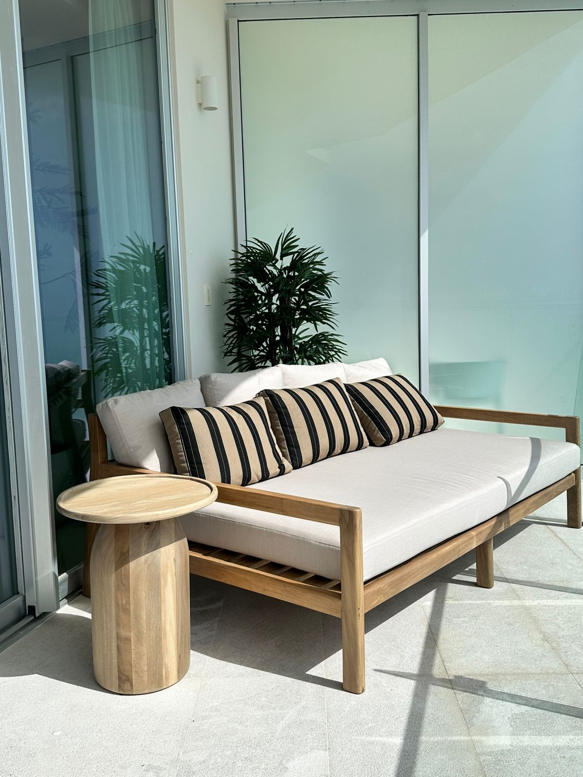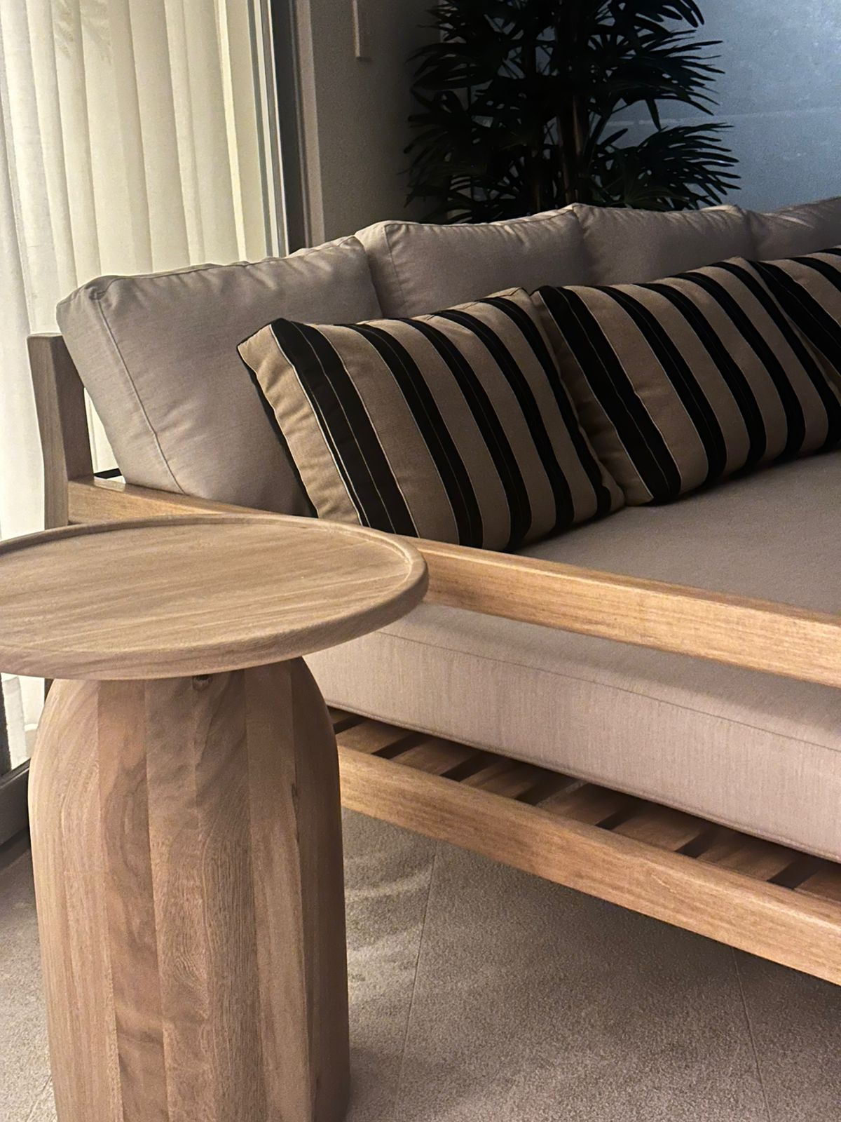 La Sala Amboseli tiene un diseño sencillo, elegante y fresco. Se elabora de madera Rosa Morada o Teca, los asientos y cojines son de tela de marca Sumbrella resistente al sol. El juego consta de 5 piezas. La mesa de centro no está incluida.