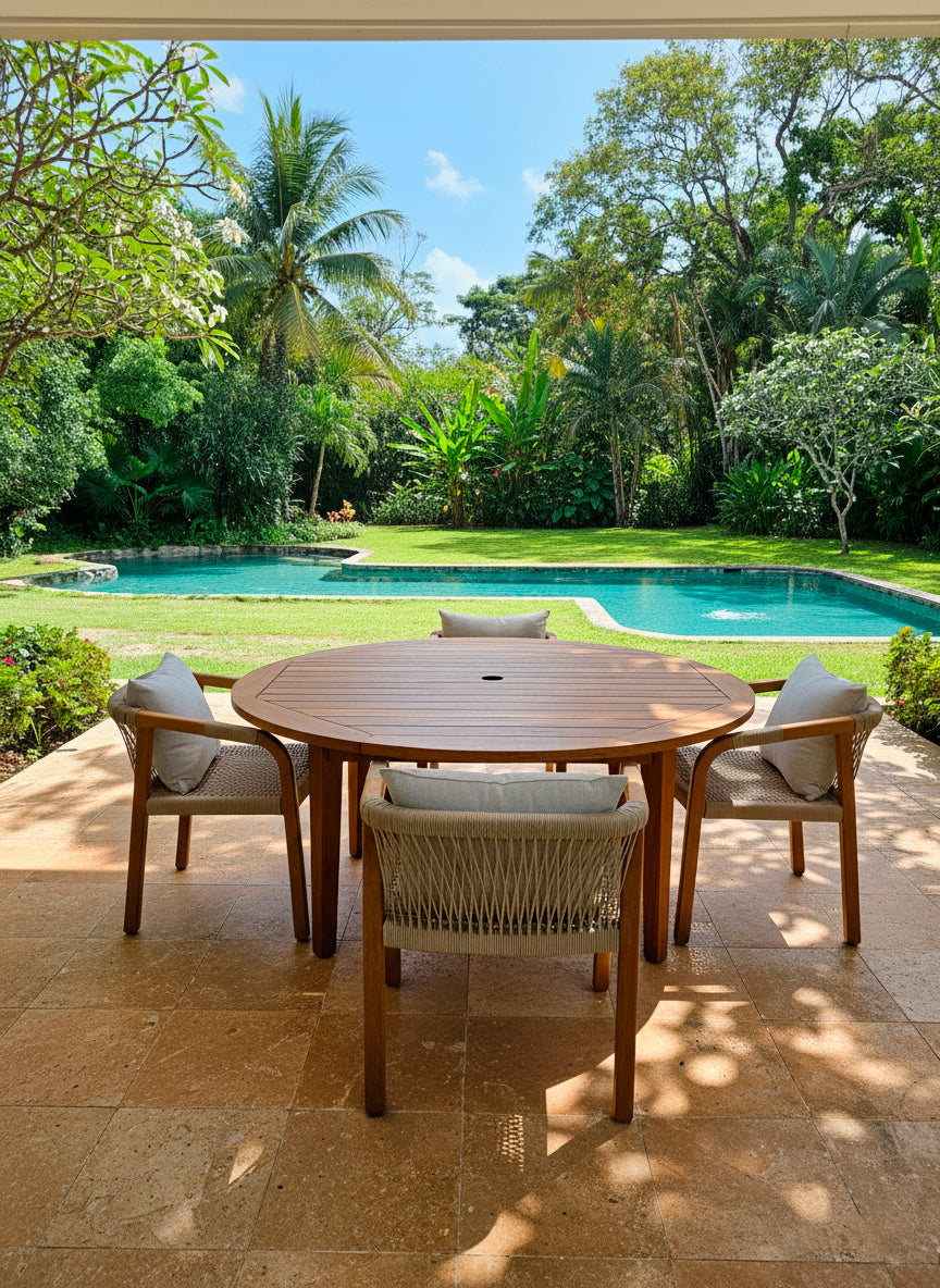La Silla Montecarlo esta elaborada en madera Teca, tejida con cordón sintético, y cuenta con un cojín de respaldo para mayor comodidad.