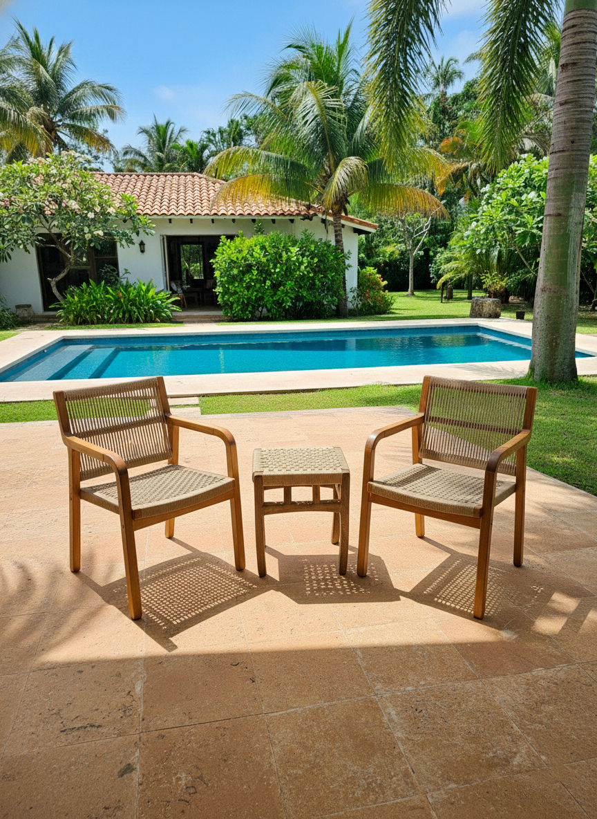 El Taburete Taormina se elabora con madera Rosa Morada, es tejido en cordón danés beige para interior. También puede ser elaborado en madera Tornillo, con una superficie de madera en lugar de ser tejido.
