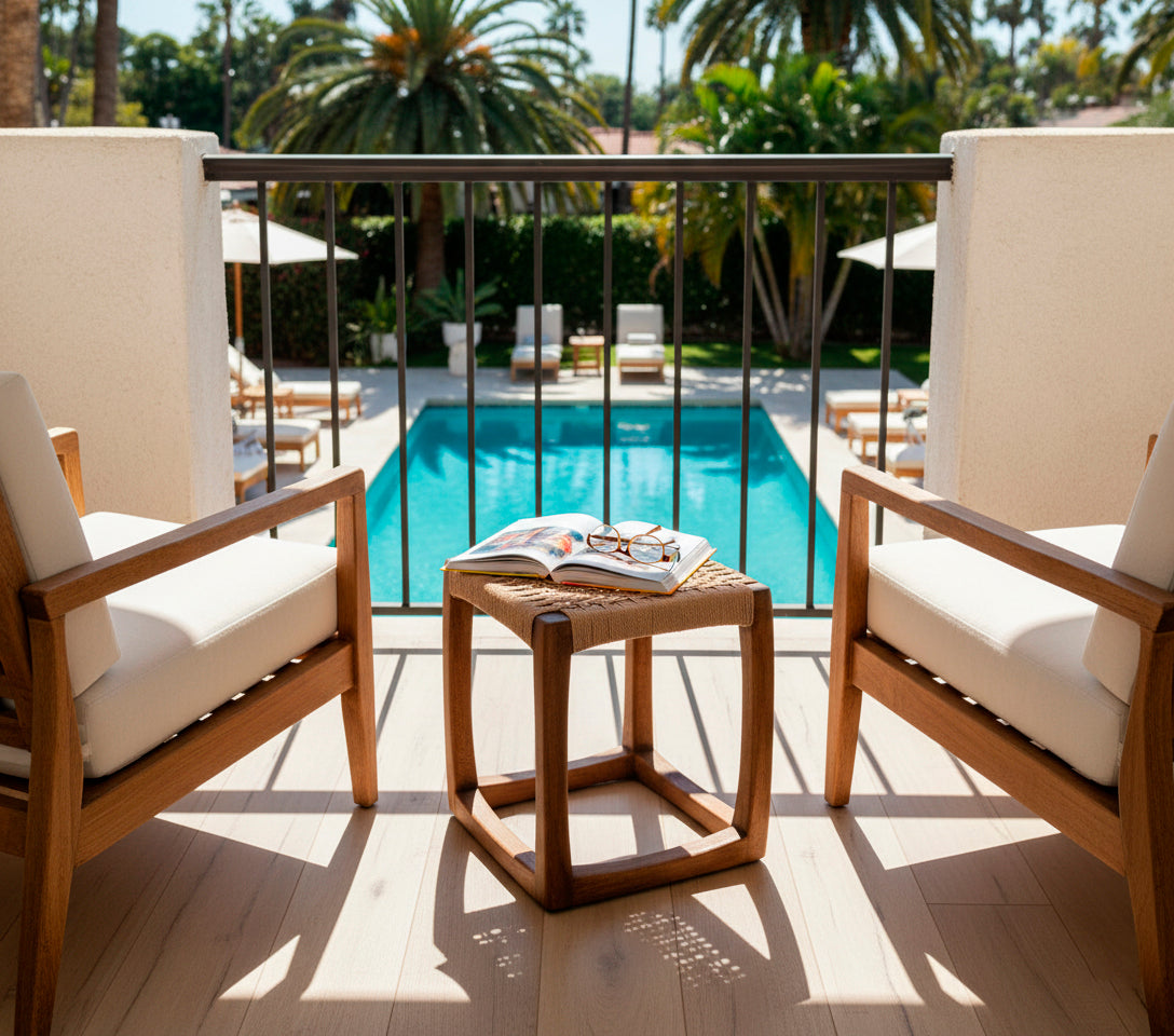 Taburete o mesita auxiliar elaborada en madera Tornillo, Rosa Morada o Teca, tejida a mano con cordón danés. Complemento ideal para la Silleta Amboseli.